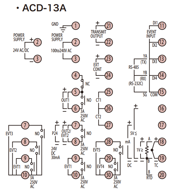 ACD-13A hỗ trợ đa dạng đầu vào, gồm thermocouple, RTD và các tín hiệu analog dòng điện hoặc điện áp DC. Hỗ trợ các dải như 0 đến 20 mA DC, 0 đến 10 mV DC, -10 đến 10 mV DC, 0 đến 50 mV DC, 0 đến 100 mV DC, 0 đến 1 V DC, 0 đến 5 V DC, 1 đến 5 V DC và 0 đến 10 V DC; mặc định nhà máy là đầu vào K với dải -200 đến 1370°C.