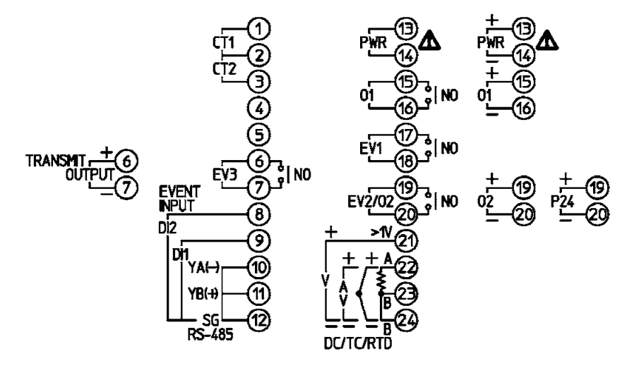 PCB1 hỗ trợ nhiều điểm mở rộng tùy option, gồm event output EV1, event output EV2, event output EV3, event input DI1, event input DI2, heater burnout alarm, insulated power output P24 và transmission output tùy model. Các chân terminal cho những chức năng này trên sơ đồ đấu nối.
