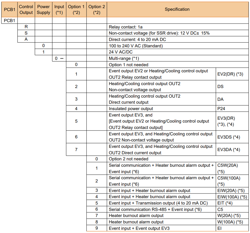 PCB1 hỗ trợ rất đa dạng tín hiệu đầu vào. Thiết bị nhận được các loại thermocouple như K, J, R, S, B, E, T, N, PL-II và C; RTD gồm Pt100, JPt100 loại 3 dây; ngoài ra còn hỗ trợ direct current 0 đến 20 mA, 4 đến 20 mA DC và các dải điện áp DC như 0 đến 1 V, 0 đến 5 V, 1 đến 5 V, 0 đến 10 V DC.
