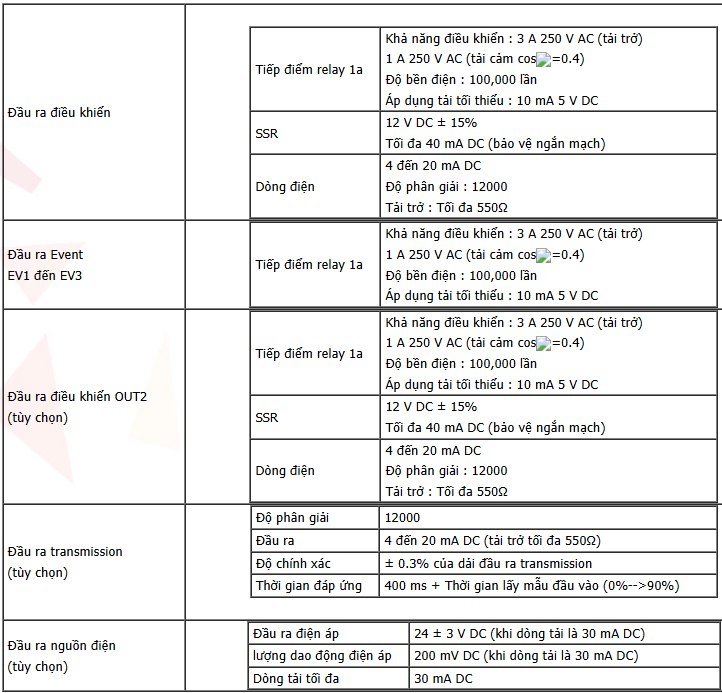 - OUT1: Người dùng có thể chọn relay contact 1a, non-contact voltage cho SSR drive 12 V DC hoặc direct current 4 đến 20 mA DC. Với relay contact, khả năng chịu tải được hãng công bố là 3 A 250 V AC cho tải thuần trở và 1 A 250 V AC cho tải cảm.