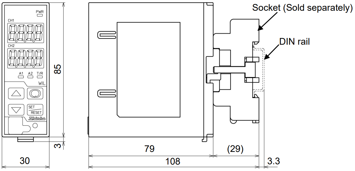 - Kích thước tiêu chuẩn 30 × 88 × 108 mm, dạng cắm đế gắn DIN rail